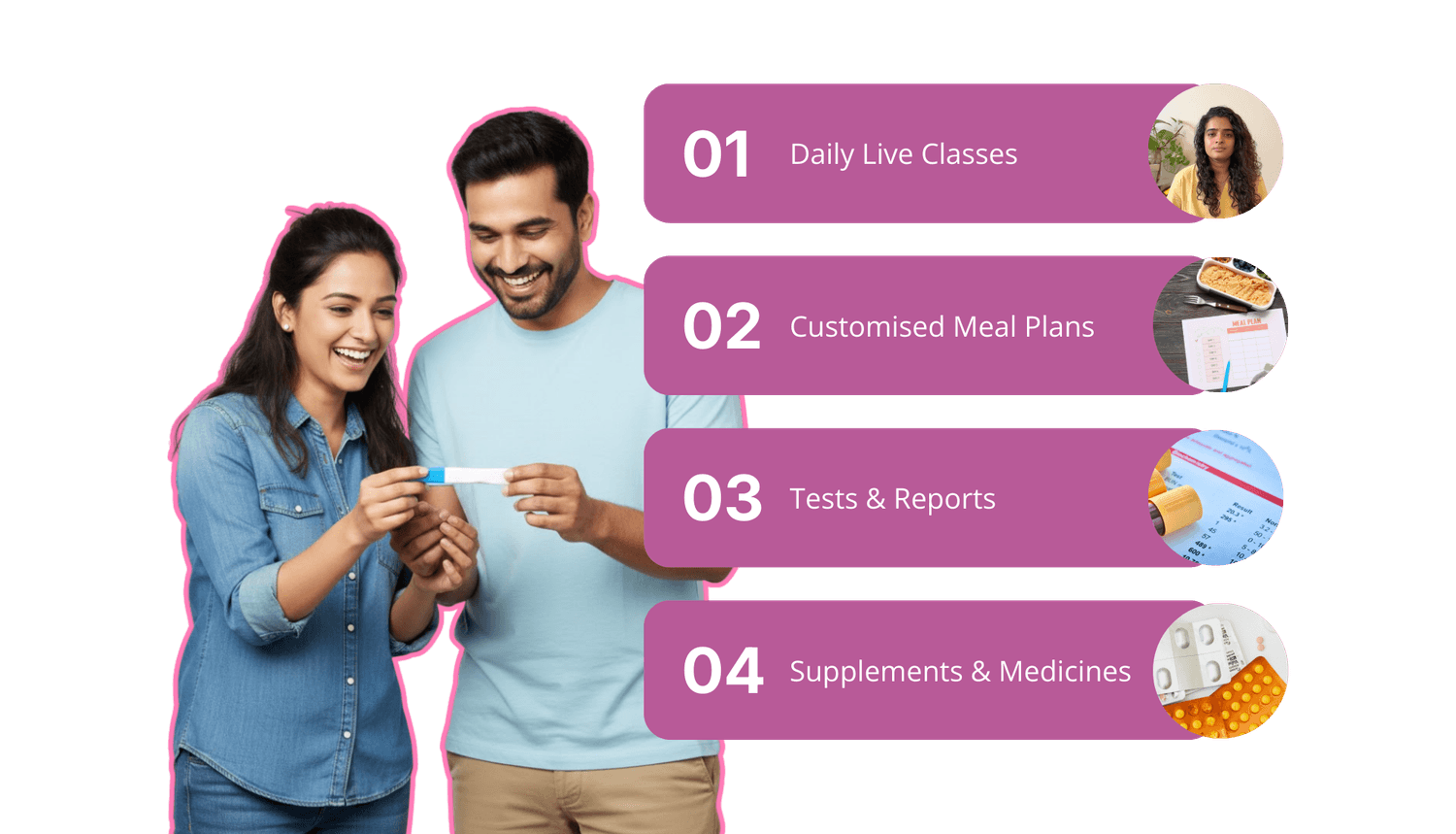 A personalised, structured program designed to improve egg quality, sperm quality, and uterine environment. Daily LIVE yoga, custom meal plans, stress regulation sessions, doctors consults for medicines & tests and a lot more.